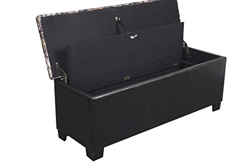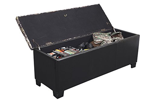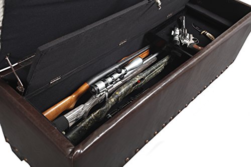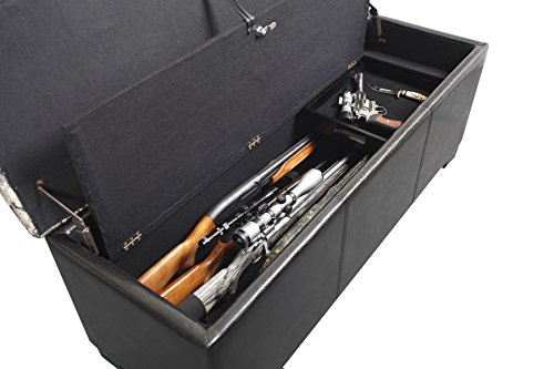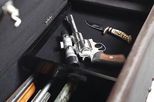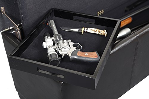 -. Feature : Locking, concealed gun compartment holds up to 5 long guns / Removable, wood accessory tray for handguns or other accessories / Ample storage in upper compartment for blankets or accessories / Soft fabric lined interior / Dual safety stays hold lid open and prevents pinching