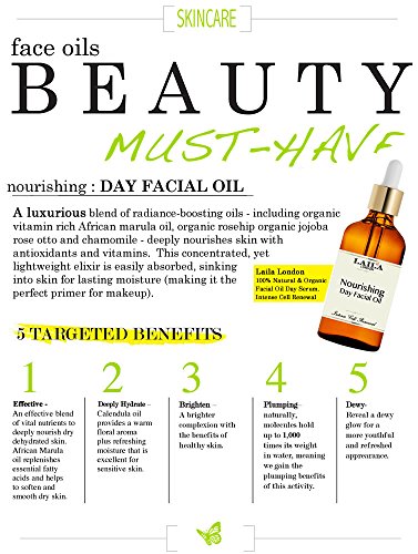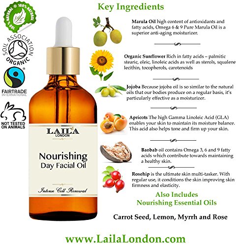 -. Binding : Misc. -. Brand : Laila London Ltd -. Feature : A nourishing elixir blended from 100% natural organic ingredients, Laila London has formulated her FACE OIL to effectively reverse the effects of damage, replenish nutrients and renew a youthful radiance. / Marula oil has deeply moisturising qualities / It addresses hair and scalp ageing at a cellular level whilst providing an improvement in tensile strength to give body and texture by penetrating the hair reaching the inner cortex / Vitamin Rich naturally containing a unique blend of rich oleic acid and linoleic acid / The ultimate Anti-Ageing Facial oil serum -. Label : Laila London Ltd -. Manufacturer : Laila London Ltd -. Model : NourishDayOil-30 -. MPN : NourishDayOil-30 -. NumberOfItems : 1 -. PartNumber : NourishDayOil-30 -. ProductGroup : Beauty -. ProductTypeName : BEAUTY -. Publisher : Laila London Ltd -. Size : 30ml -. Studio : Laila London Ltd -. Title : Nourishing Day Face Oil Serum 100% Pure & Organic Rich in Antioxidants, Vitamin C Anti-aging with Moisturizer Hydrating Marula, Jojoba, Rosehip. For Radiant Youthful Skin 100% Unconditional Made in Uk