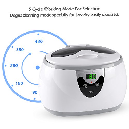 - 5 Working Modes for different cleaning needs (90,180,280,380,480 seconds). The ultrasonic cleaner will shut off automatically when selected cleaning cycle finished.