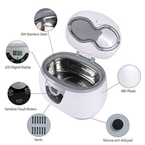 - Sensitive Touch Control and Digital Display with led indicator.Much easier to operate.Built-in 600ml stainless steel tank,plastic basket and watch stand for both small and large jewelry.