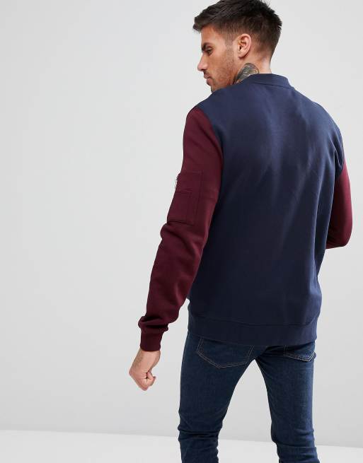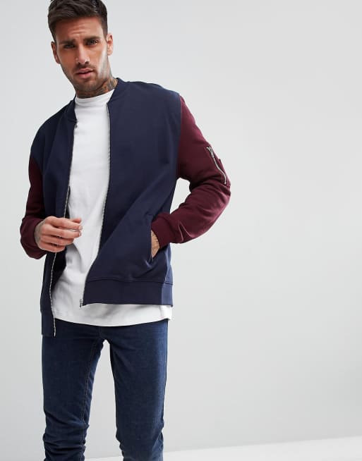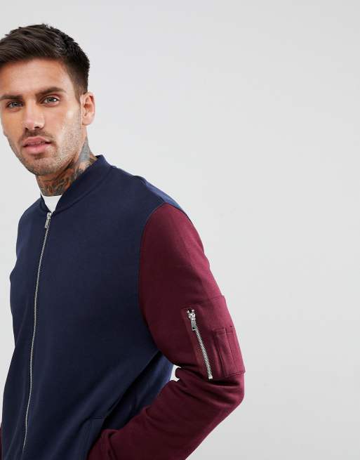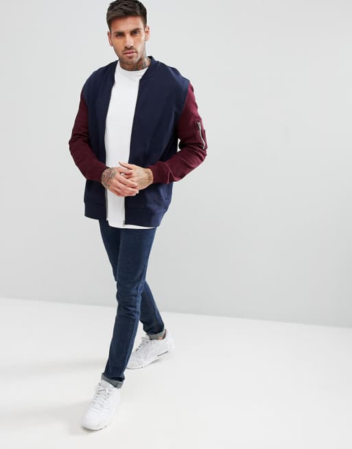 ASOS Jersey Bomber Jacket With Contrast Sleeves And MA1 Pocket In Navy