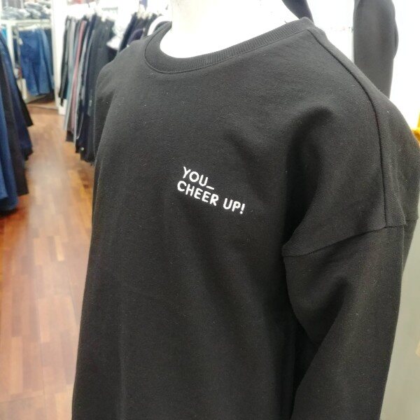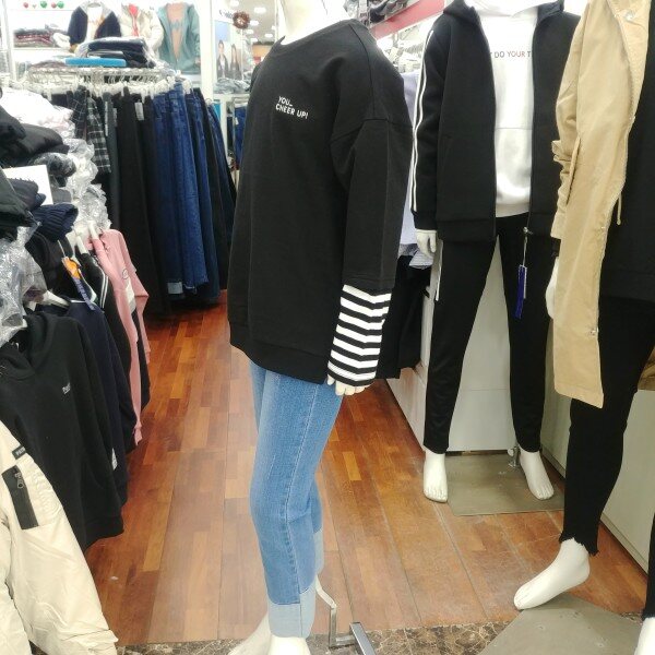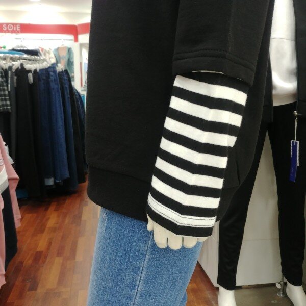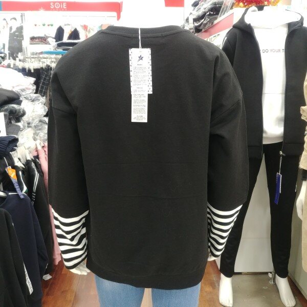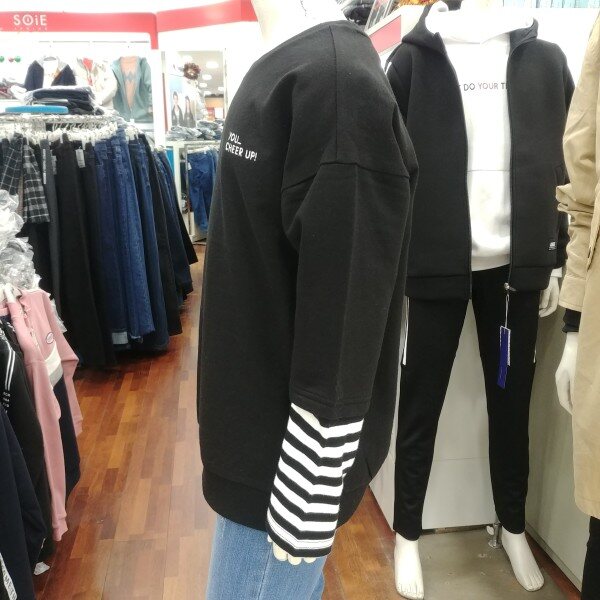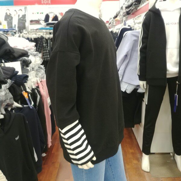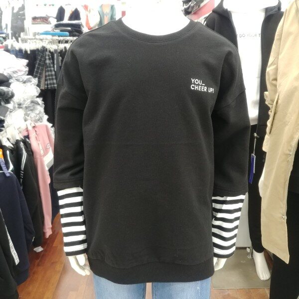 아기자기 귀여운 개구장이 같은 느낌을 주는 맨투맨 입니다.남녀 공용으로 사이즈를 한단계 위로 입으셔도 좋은 디자인 입니다.팔꿈치 아래 부분의 줄무늬 레이어드 디자인이 돋보입니다.