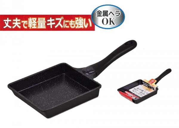 | アルミ鋳物製で軽量を実現し、金属ヘラも使えるマーブル加工を施した玉子焼フライパンです。 |
