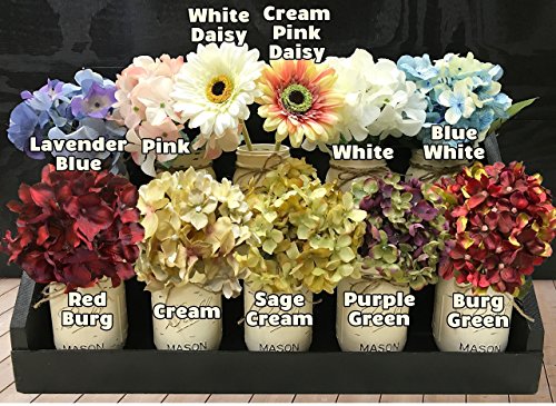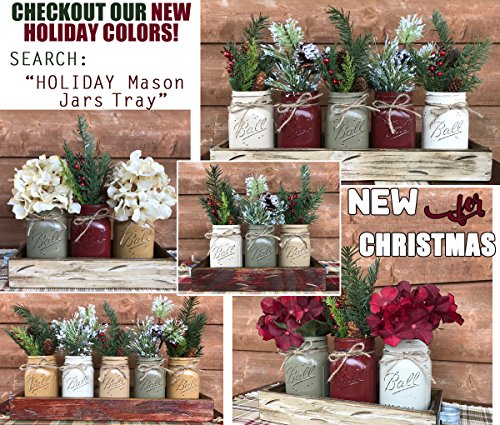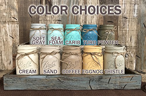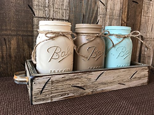 -. Title : Mason Canning JARS in Wood Antique White Tray Centerpiece with 3 Ball Pint Jar - Kitchen Table Decor - Distressed Rustic - Flowers (Optional) - CREAM, COFFEE, SEAFOAM Painted Jars (Pictured)