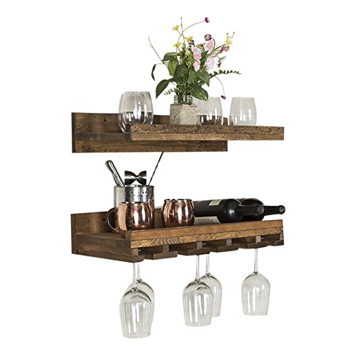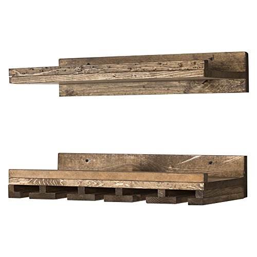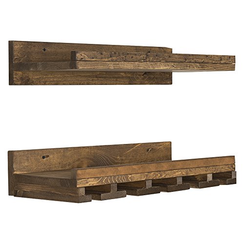 del Hutson Designs Rustic Pine Wood Floating Wine Shelf and Glass Rack Set, 6" x 24" x 10", Dark Walnut