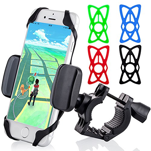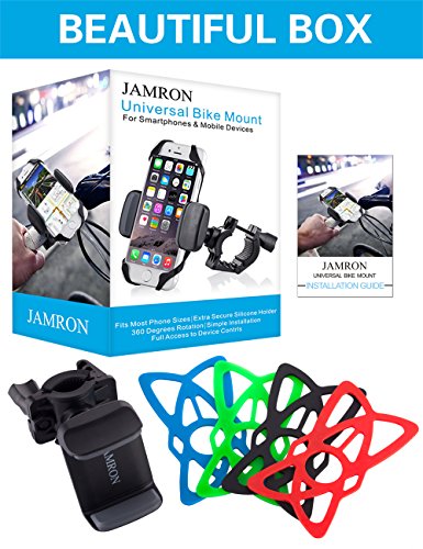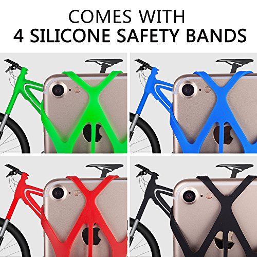 ✓FOUR COLOR EXTRA STRONG AND ELASTIC SILICONE BANDS - JAMRON phone mount for bike comes with total of four silicone butterfly bands (black, red, green,blue) so you can choose colors and have backup bands if you need them. BEWARE of low quality common rubber bands.
