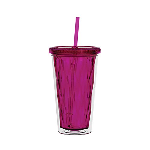 16oz. Double Wall Acrylic Tumbler with Colored Multi-Faceted inner liner and matching straw. Lid is threaded, with silicone seal gasket. For use with Hot or Cold liquids. BPA Free, not for use with Microwave or Freezer. Hand Washing is recommended due to unkown variations in individual washing machine temperature and abrasiveness. Machine wash at your own risk.