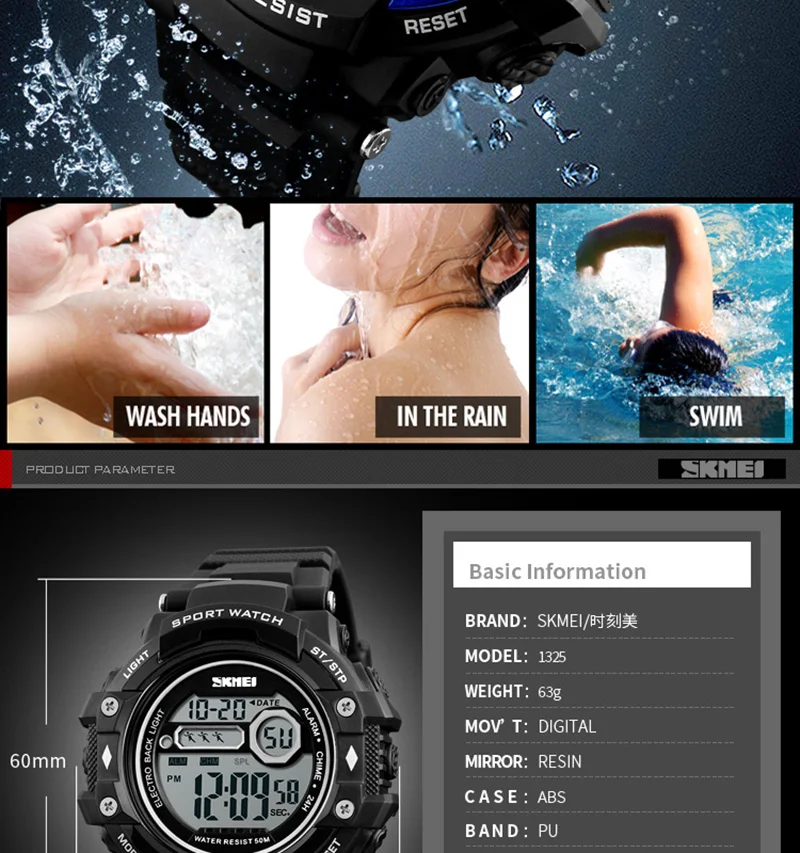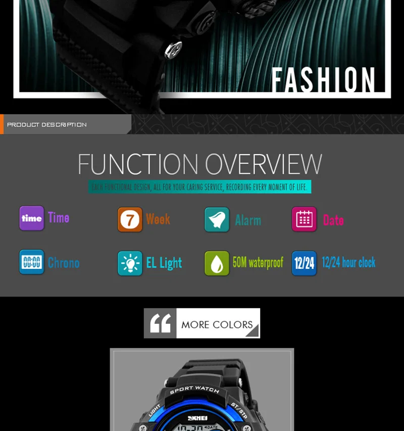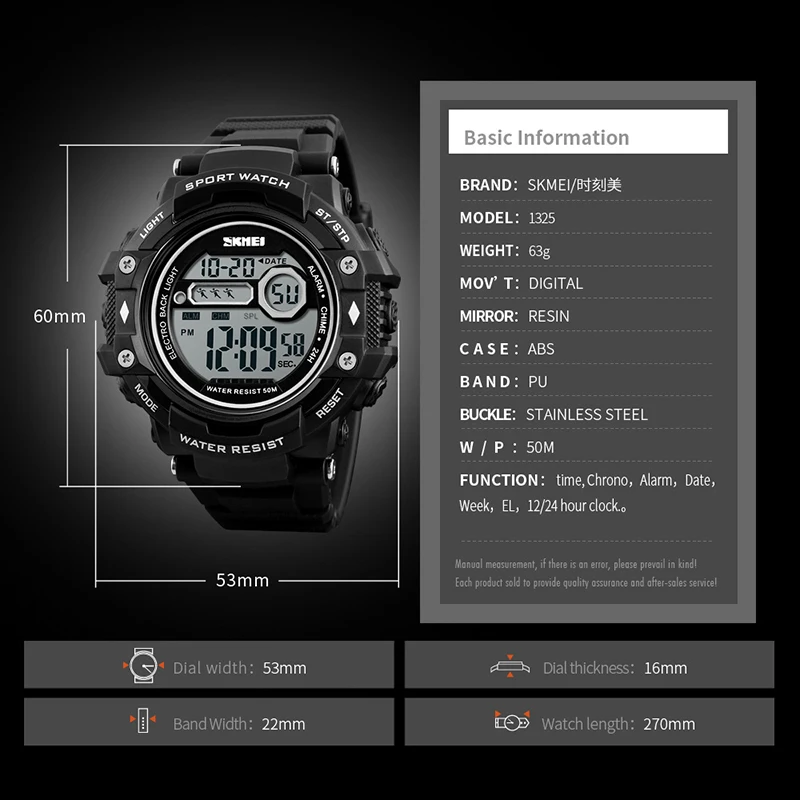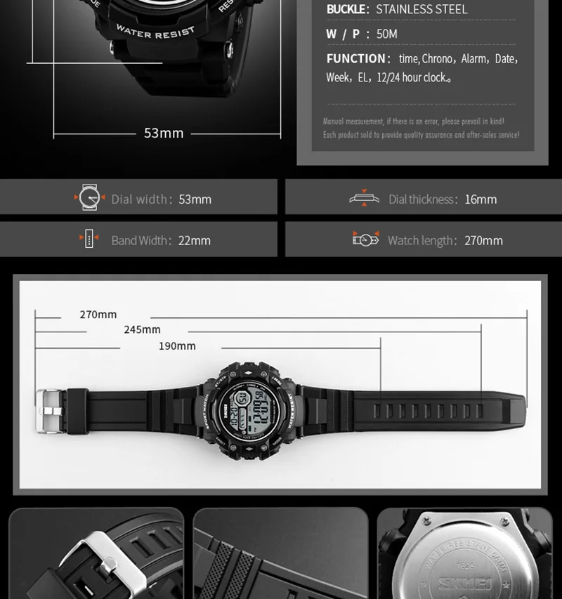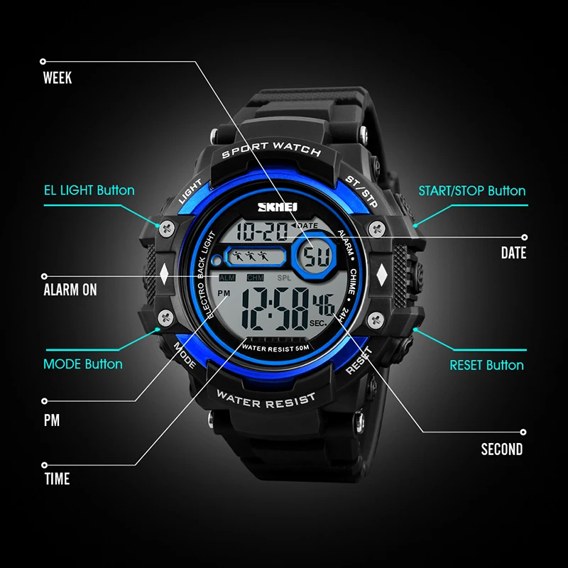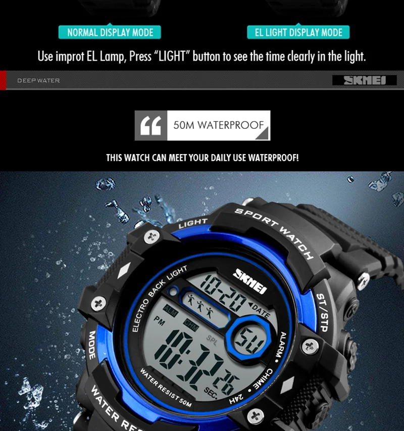 Functions:Water Resistant,Alarm Clock,12/24 Hour ClockWeek Display,EL Light,Date