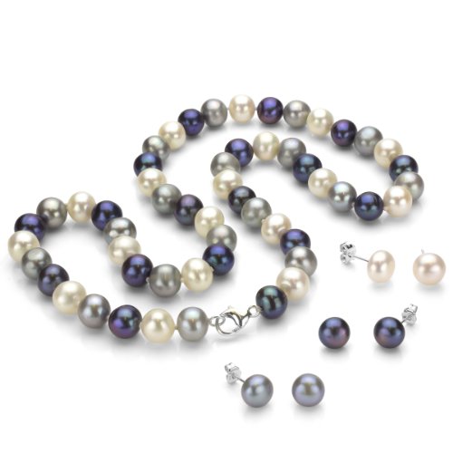 -. Title : Sterling Silver 8-8.5m Dyed-multicolor Freshwater Cultured Pearl Necklace and 3 Pairs Stud Earrings