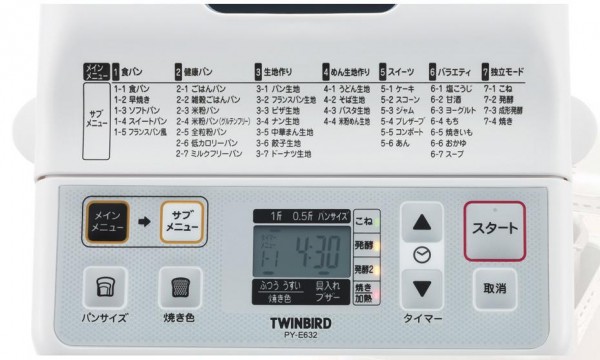 | 仕様 | 電源:AC100V 50/60Hz 消費電力:430W(ヒーター400W モーター30W ) 容量:食パンの場合・1.0斤/ 0.5斤 タイマー:13時間(焼き上がりまで) 電源コード長:1.4m 搭載メニューモード:40 |