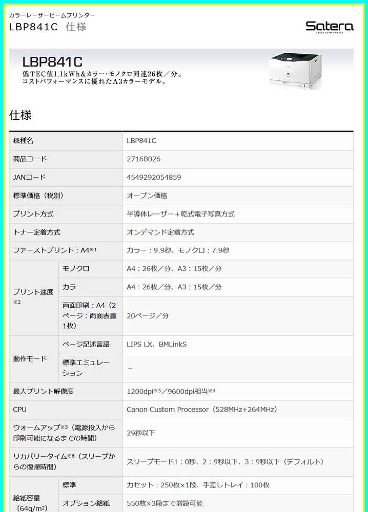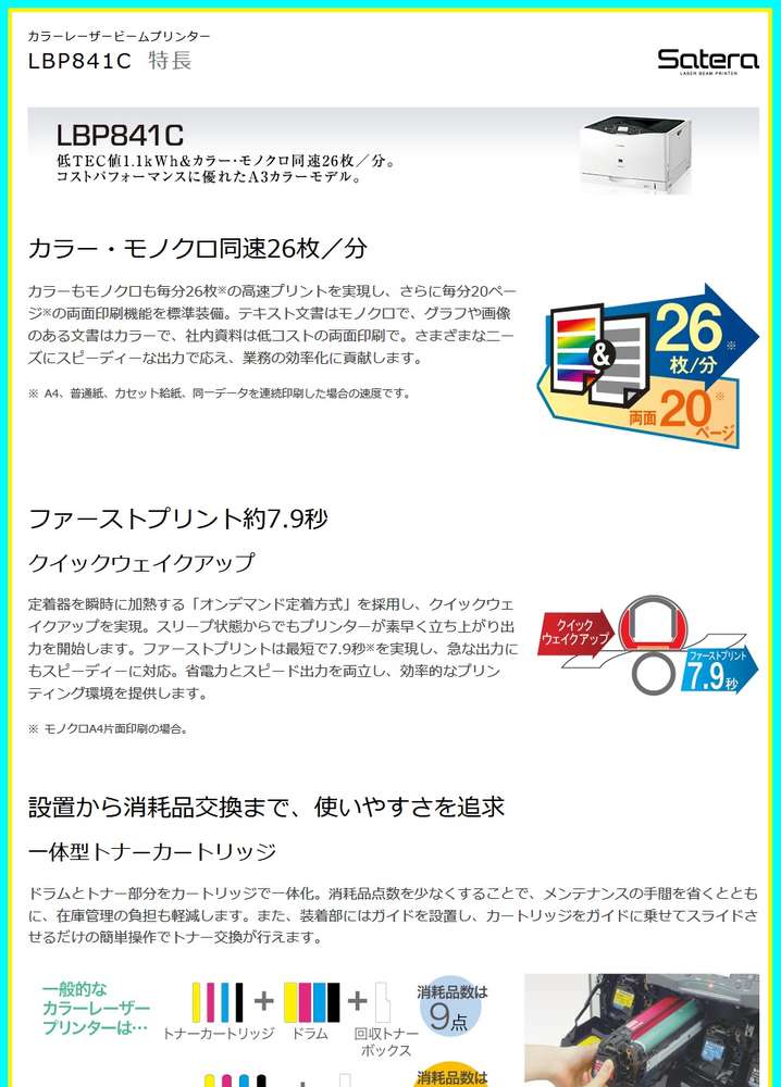 ●プリント速度:A4:26枚/分(モノクロ)、A4:26枚/分(カラー)、20ページ/分(両面印刷:A4)