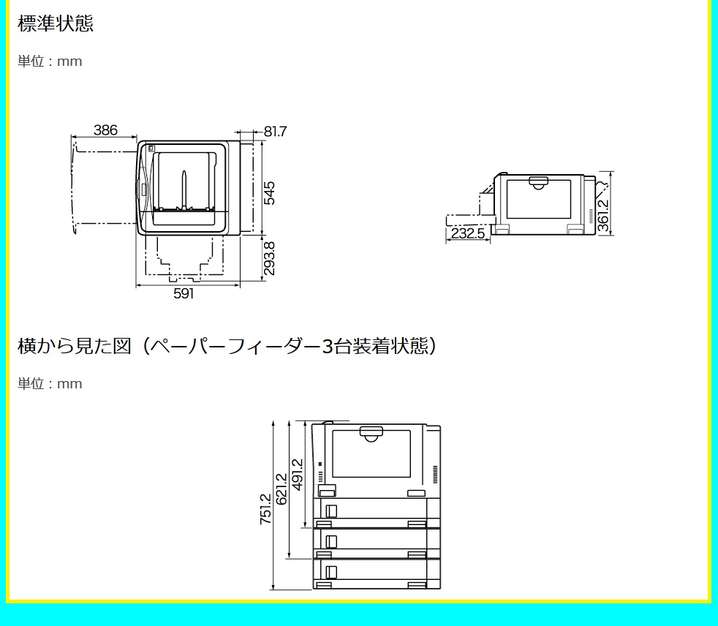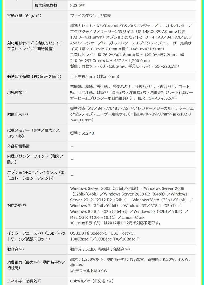 ●給紙容量:カセット:250枚×1段、手差しトレイ:100枚(標準)、550枚×3段まで増設可能(オプション給紙)、2000枚(最大給紙枚数)