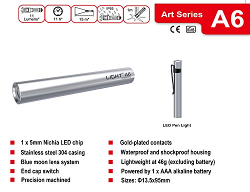 Product Description LIGHT2 Art Series A6 LED Flashlight Simple and beautiful design Shockproof and Waterproof housing Stainless steel compact pen light to carry around at any time! With Clip too! 0