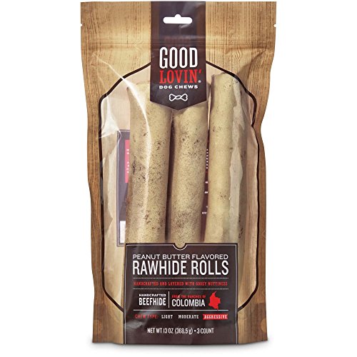 -. Binding : Misc. -. Brand : Good Lovin' -. EAN : 0800443273920 -. Feature : Peanut Butter Flavored Rawhide Roll Dog Chews from Good Lovin' / Beefhide is handcrafted and layered with gooey nuttiness / Chew Type, Aggressive / From the ranches of Colombia / Satisfies their instinct to chew -. Label : Good Lovin' -. Manufacturer : Good Lovin' -. MPN : 2730808 -. PackageQuantity : 1 -. PartNumber : 2730808 -. ProductGroup : Pet Products -. ProductTypeName : PET_SUPPLIES -. Publisher : Good Lovin' -. Studio : Good Lovin' -. Title : Good Lovin' Peanut Butter Flavored Rawhide Roll Dog Chews, 10-inch, Pack of 3 -. UPC : 800443273920