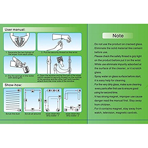 -. Feature : HIGH QUALITY: ABS with natural latex, double sided design with Strong absorption magnet, durable to use. it is very safe and convenient. / SAFE & ENVIRONMENTALLY: You can stay in your room to clean the outside window, ensuring your safety as well all you need is warm water and plain detergent to clean conveniently. / USED FOR: It can be used to clean windows, greenhouses, fish tanks, conservatories, skylights, patio doors, bedroom windows and even shower screens, mirror and tiles. / Features: Magnetic double sided window cleaner. Clean your windows quickly and effectively Wash and dry both sides of the windows at the same time Get twice the result with just half the effort. Can be used for sliding doors, windows, vehicle windows, shower screens, mirrors, any glass surfaces. / NOTICE - Please choose the approP.R.Iate Version according to the thickness of the glass, otherwise it will be strong or not. This item is not perfect and it has some skill to use, it is better to watch video to learn how to use it (you can find on YouTube).