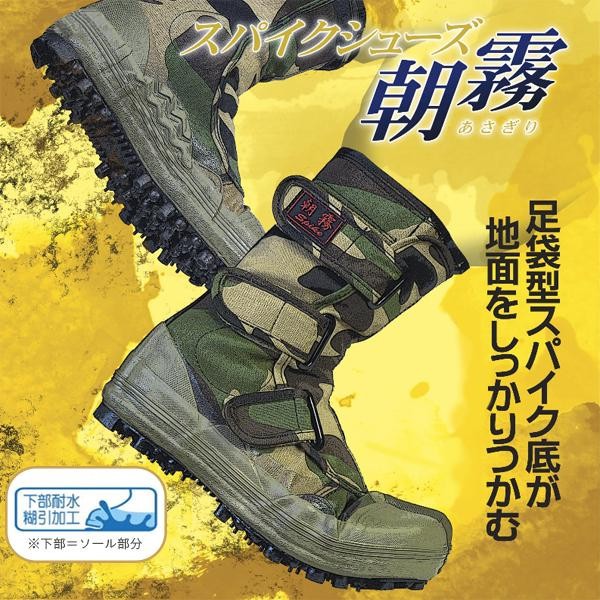 | 踏ん張りが効く足袋型のスパイク底が、山の斜面や田畑などの法面(のりめん)でも地面をしっかりつかみ、下半身のブレを安定させ上半身の作業姿勢をキープできるようにサポートします。履き口のズボン止めによって、靴からズボンが抜けにくい仕様に。山仕事・草刈り・山菜採りなどに活躍!! |