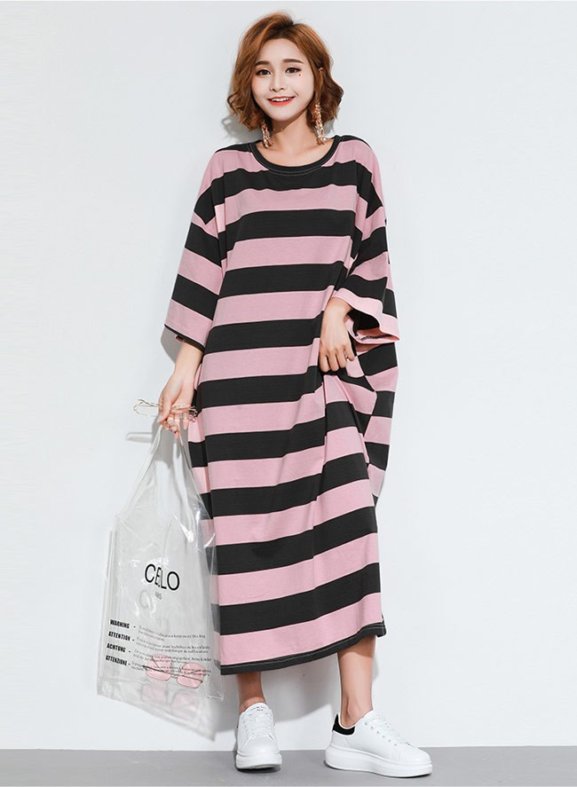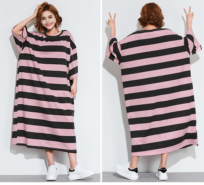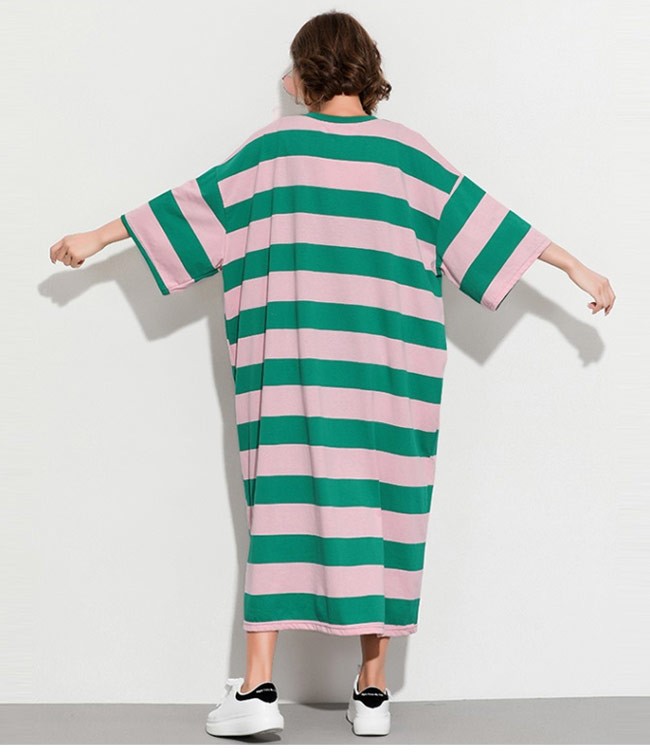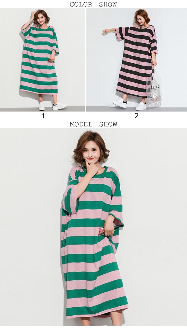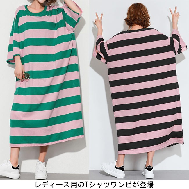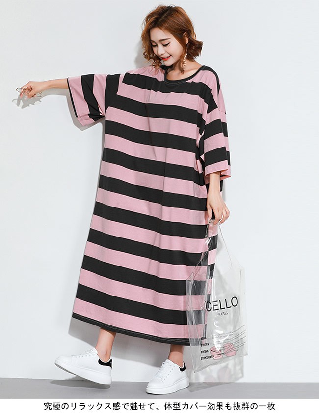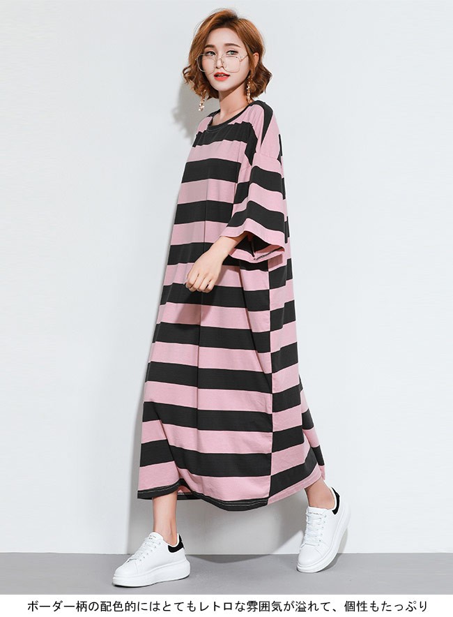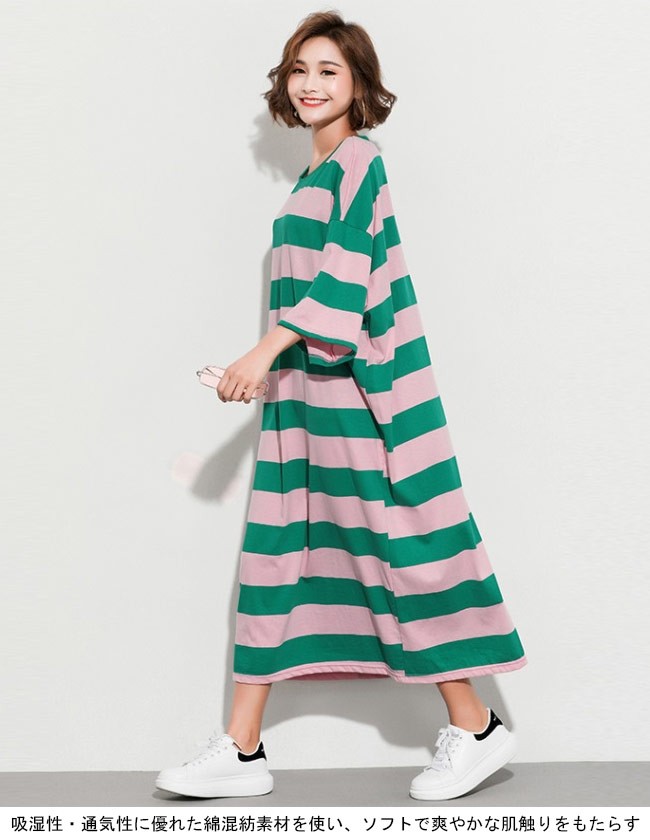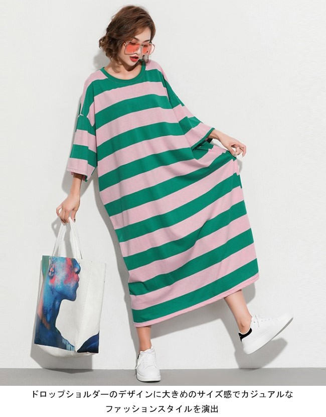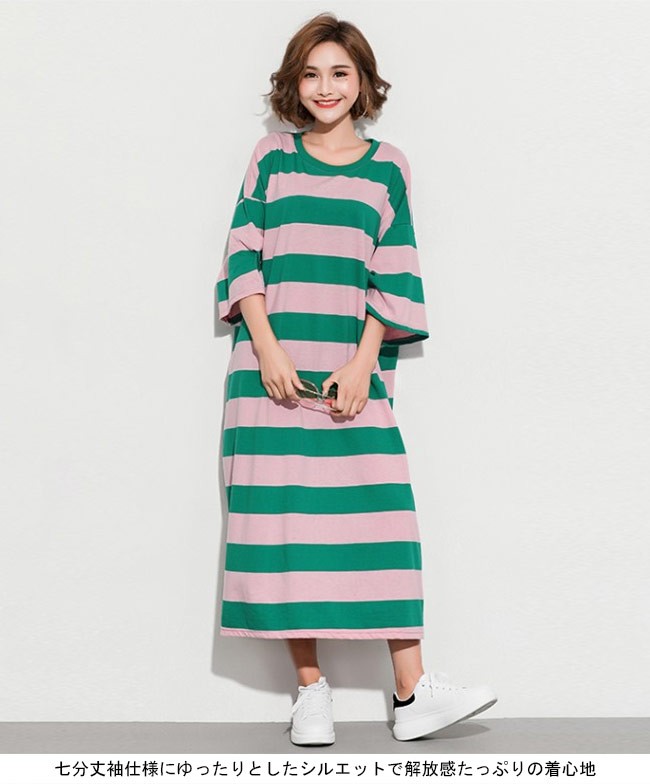 Tシャツワンピ ロング 七分丈袖 レディース ボーダー柄 ロングワンピ ゆったり ドロップショルダー 女性用 マキシ丈ワンピース 体型カバーレディース用のTシャツワンピが登場七分丈袖仕様にゆったりとしたシルエットで解放感たっぷりの着心地吸湿性・通気性に優れた綿混紡素材を使い、ソフトで爽やかな肌触りをもたらすドロップショルダーのデザインに大きめのサイズ感でカジュアルなファッションスタイルを演出ボーダー柄の配色的にはとてもレトロな雰囲気が溢れて、個性もたっぷり究極のリラックス感で魅せて、体型カバー効果も抜群の一枚カラー:1 2素材 綿混紡サイズ(cm) FF 総丈118 バスト144 肩幅63ご注意:※サイズは平置きサイズです。素人採寸ですので、若干の誤差がございます、ご了承ください。
