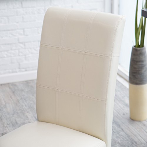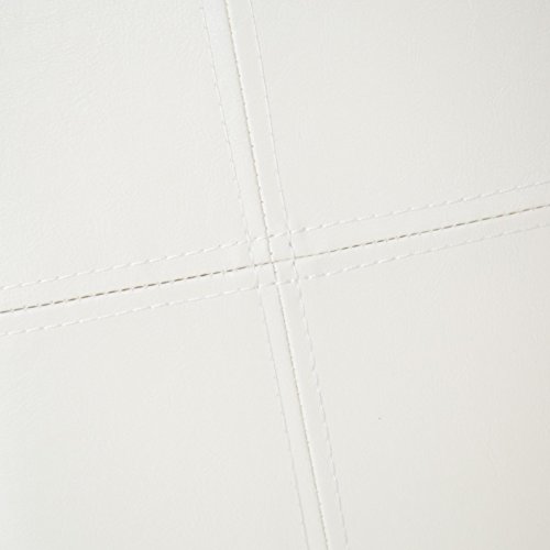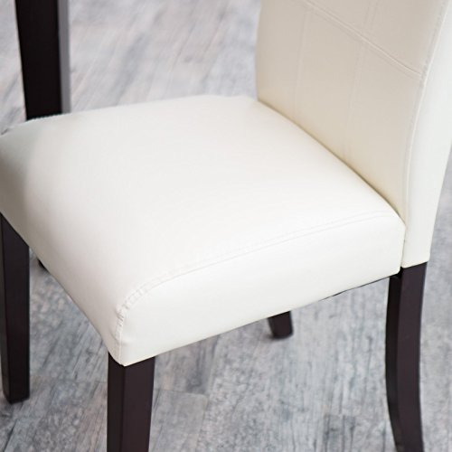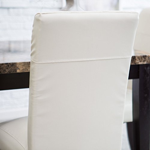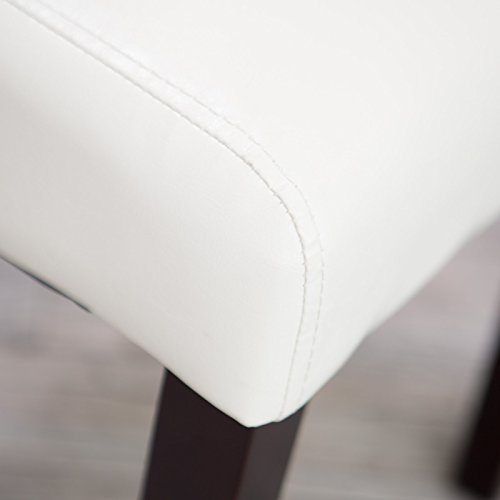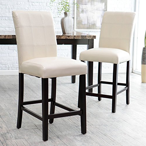 -. Feature : Set includes 2 contemporary counter-height stools / Solid wood frame and straight legs / Ivory faux leather upholstery with decorative stitching / Espresso brown finish on legs; footrests / Dimensions: 19.25L x 23.5W x 43H in.; Seat height: 26 in.