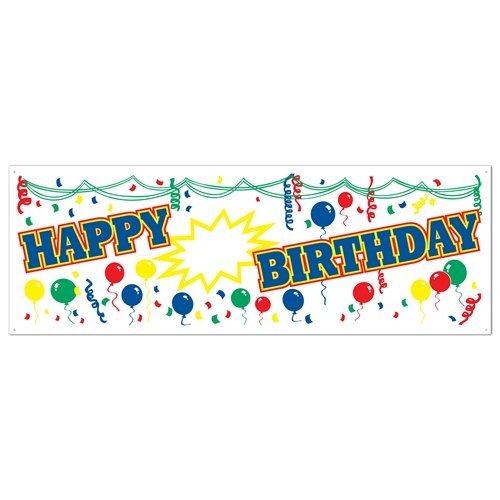 Studio : The Beistle Company Publisher : The Beistle Company Binding : Kitchen Product Description Beistle 57639 Happy Birthday Sign Banner. This all-weather plastic banner has a metal grommet in each corner to be used when hanging. The banner has a great birthday design in several different colors and there is a blank area in the middle that can be personalized. This banner is 21 Inch tall by 5 feet wide. 0