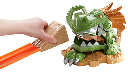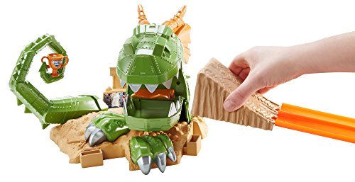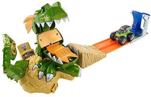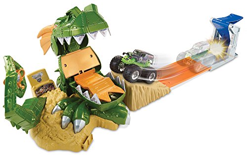-. Binding : Toy -. Brand : Hot Wheels -. EAN : 0885213184286 -. Feature : Jump past the dragon's massive jaws to claim the chomp-ionship trophy / Kid-activated slam-blast launcher sends vehicles racing down the track / Beware! The dragon can chomp down at any time! / Includes one 1:64-scale Monster Jam Grave Digger truck / Connects to other Hot Wheels track to build the world of play -. IsAdultProduct : 0 -. ItemPartNumber : CCP74 -. Label : Hot Wheels -. Manufacturer : Hot Wheels -. Model : CCP74 -. MPN : CCP74 -. PackageQuantity : 1 -. PartNumber : CCP74 -. ProductGroup : Toy -. ProductTypeName : TOYS_AND_GAMES -. Publisher : Hot Wheels -. Studio : Hot Wheels -. Title : Hot Wheels Monster Jam Dragon Arena Attack Playset -. UPC : 885529708213 -. Warranty : 1 year warranty against manufacturer defects