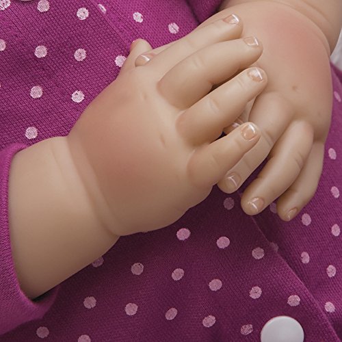 Smitten Kitten's head and 3/4 arms and legs are made of GentleTouchTM vinyl which is very soft and realistic. She is 20" tall. She has a fair skin tone and dark brown hair. Her body is weighted cloth for a real baby feel!