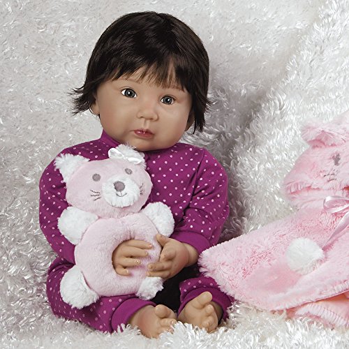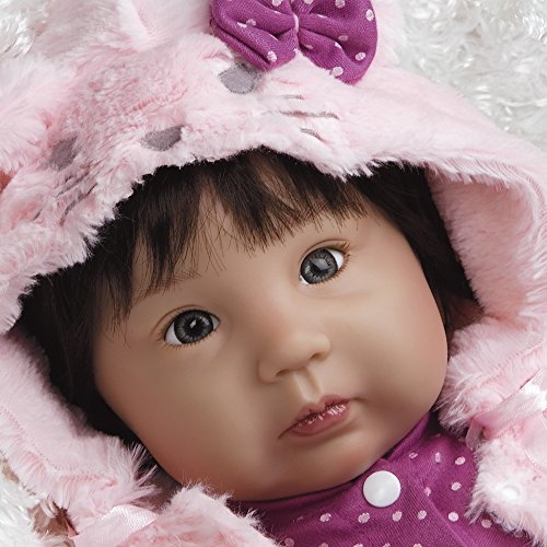 Introducing the first doll of our 2018 collection! Talk about purr-fect, Smitten Kitten, sculpted by award-winning doll designer Ping Lau, is 20" realistic baby doll of mixed Asian descent and is ready to be loved by you! Her weighted cloth body, GentleTouchTM vinyl head/arms/legs, and her handpainted eyes/fingertips/toes are just a few of her lifelike features. Her olive complexion, smoky grey eyes and wispy brown hair, highlighted by her adorably cute bangs give her a precious yet playful look. Her super soft and fuzzy pink cape with kitten hood is accented with a purple and magenta bow that matches her long-sleeved polka dot onsie and purple socks. She also comes with a cute plush kitten rattle. Smitten Kitten--and all Paradise Galleries dolls--comes with a numbered Certificate of Authenticity including artist's signature and an exquisite collector's or gift box.Feature