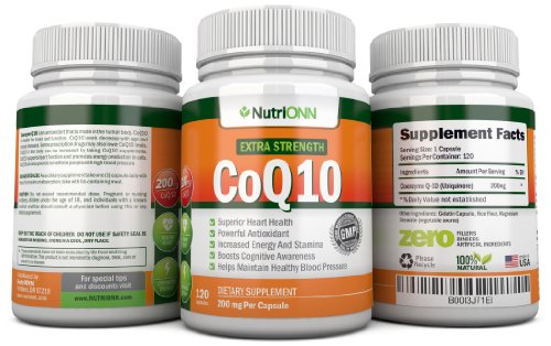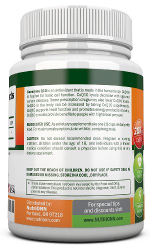 -. Feature : NutriONN's Extra Strength CoQ10 is the Top Rated 100% Pure Natural form of CoQ10 with the highest value of 200mg Per Capsule that equals to a 4 Month Supply! That's 4 months worth of CoQ10 in one bottle! Best value on Amazon. / Coenzyme Q10 has been clinically shown to support your immune and nervous system, help maintain healthy blood pressure, increase your energy and stamina levels, boost cardiovascular health, and reduce the normal signs of aging. / CoQ10 is needed for basic cell function. CoQ10 levels decrease with age and certain diseases. Some prescription drugs may also lower CoQ10 levels. CoQ10 in the body can be increased by taking CoQ10 supplements. / 200 mg Per Capsule, 120 Premium High Absorption Capsules Per Bottle. Twice the number of milligrams and value per bottle than any brand. Made in the USA following strict GMP manufacturing standards. / 100% Money Back Amazon Satisfaction Guarantee. This is the BEST offer you can find.