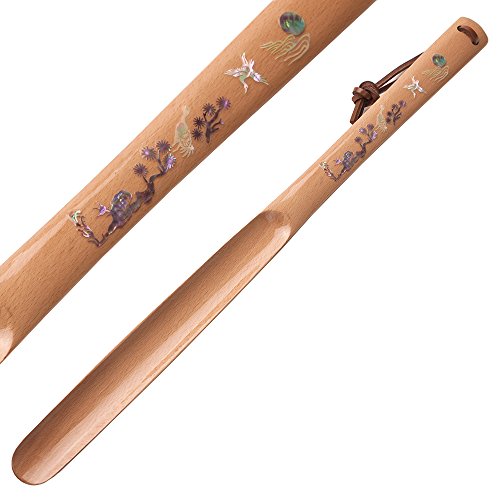 Product Description This wood shoe horn is ornamented with an intricate mother of pearl designs of cranes and the old pine tree, a symbol of elevated consciousness and dignified spirit. The elaborate adornment with the iridescence of mother of pearl designs makes it an impressive item for collection. 0