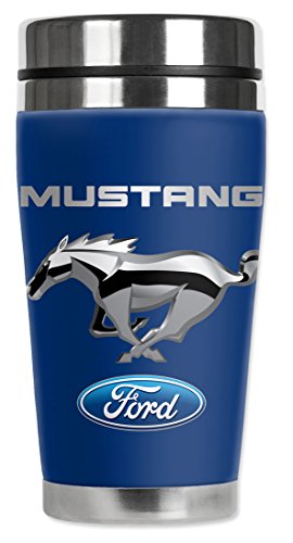 Mugzie Ford Mustang Chrome Pony Travel Mug with Insulated Wetsuit Cover, 16 oz, Blue