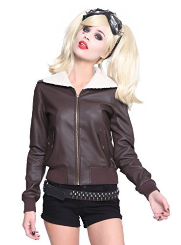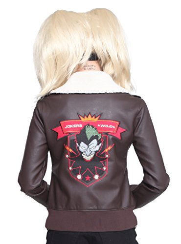 Transform into the adorable yet deadly Harley Quinn in this jacket from the Hot Topic exclusive DC Comics Bombshells collection. Brown aviator style jacket with "Jokers Wild" embroidered detail on the back, faux fur lined collar and two front pockets. Front zipper closure.Feature