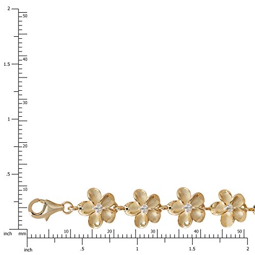 A plumeria link bracelet made from sterling silver with a 14K yellow gold finish. Each plumeria has a sandblast finish and polished petal edges. Flowers are 10mm wide (approximately 3/8 of an inch). Size 7. Gift box included. From Honolulu Jewelry Company, Honolulu, Hawaii.Feature