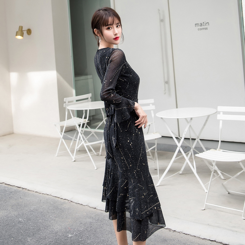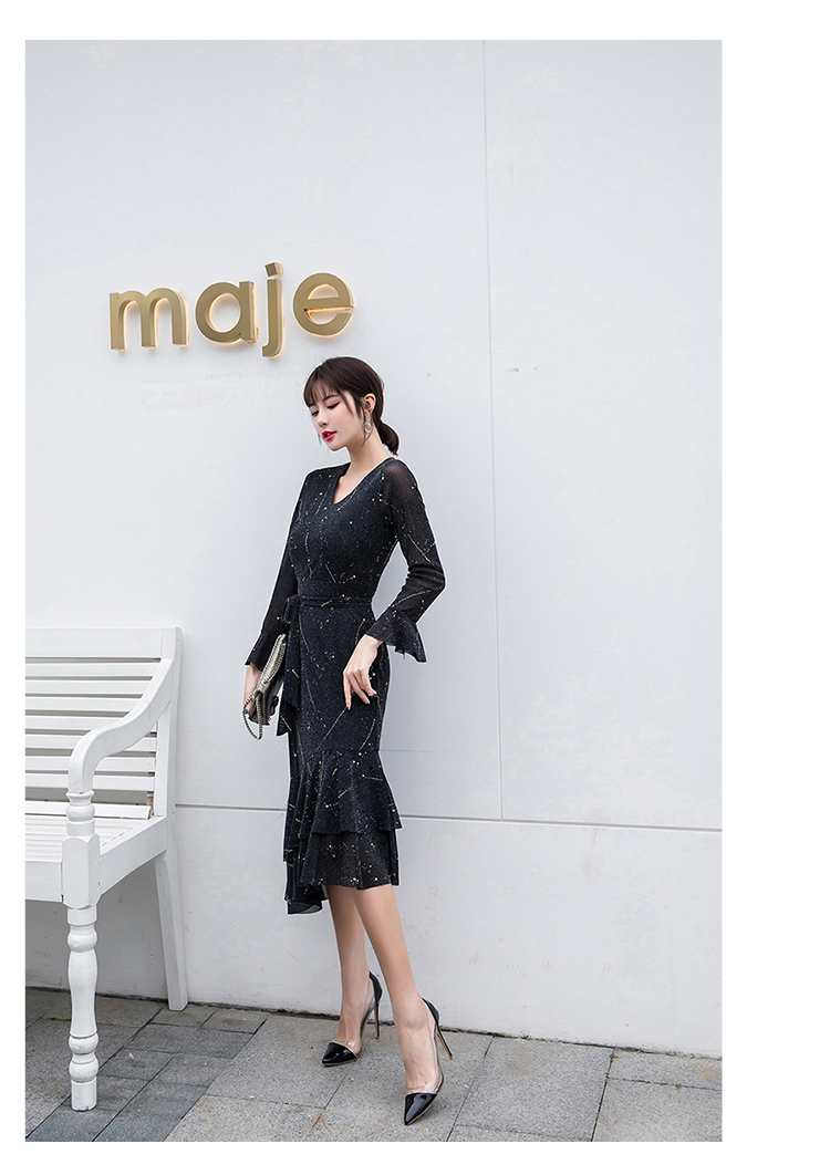 ワンピースドレス 流星柄 フレッシュテール フレア 長袖 ロング丈 二次会 結婚式