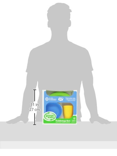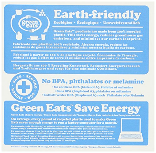 -. Feature : The green eats tabletop set consists of plate, bowl, and tumbler / Dishwasher safe too, packaged using only recycled and recyclable materials / Tumbler: 12 ounce, 4" high, diameters of 3 1/2" at the top and 2 1/4" at the base, plate: 10" diameter, bowl: 5 1/2" diameter at top, 2" high / Made in the USA from 100% food-safe recycled plastic milk containers / Green Eats manufacturing processes save energy and reduce greenhouse gas emissions