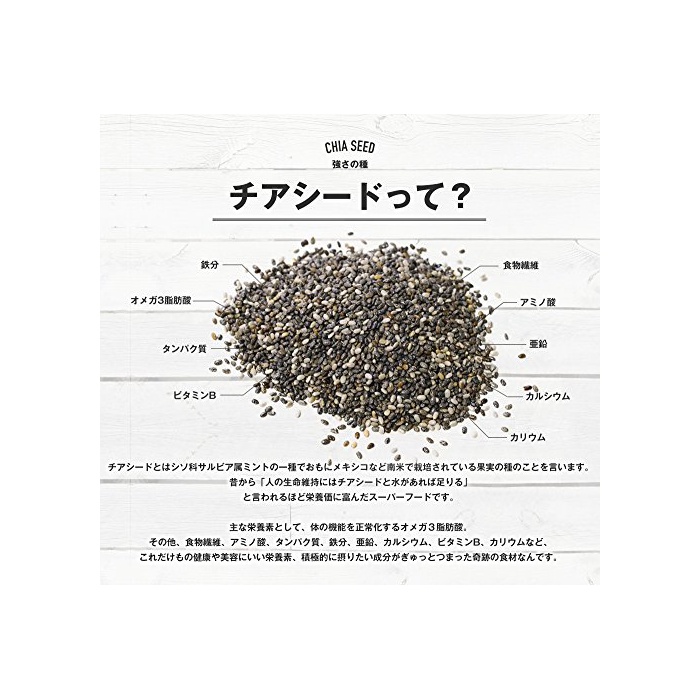 「치아시드(Chia Seed)」서는 중남미 원산 차조기과의 식물의 종에,고대 아스《데카》시대부터 전해지는 슈퍼 후드의 임금님.단백질이나 필수 아미노산,비타민,미네랄을 밸런스 잘 포함하고, 주목의 오메가3지방산의α-re 노 렌산은 자연계의 고함유량을 자랑합니다.애슬리트(운동선수) 서포트,다이어트 보조에 기대되고, 멀티 서포트 하는 자연의 하사품입니다.