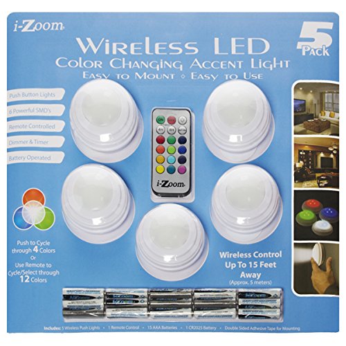 - (5) i-Zoom Wireless LED 12 Color Changing Puck Lights, (1) Remote Control, (15) AAA Batteries, (1) CR2025 Battery, Adhesive Mounting Tape, White Cases, New In Retail Packaging