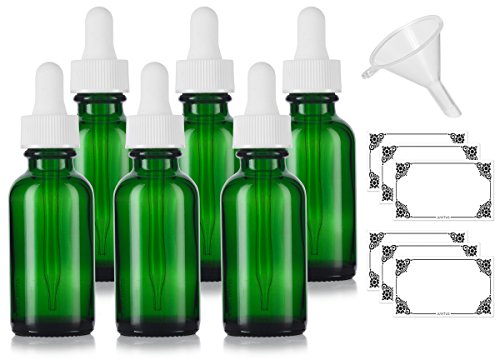 1 oz Green Glass Boston Round White Dropper Bottle (6 pack) + Funnel and Labels for essential oils, aromatherapy, e-liquid, food grade, bpa free