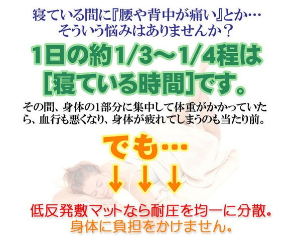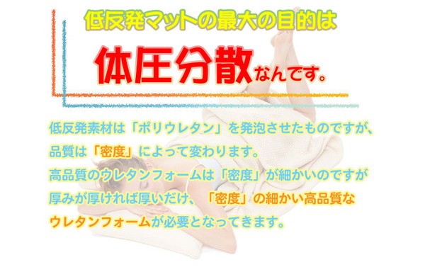 ゆっくり沈んで、体圧を吸収、分散するので肩や腰に負担をかけず、グッスリと眠れ、目覚めもスッキリ!厚さ8cmなので、ベッドマット代わりに敷けば寝心地がぐーんとUP!より心地良い睡眠をサポートします。