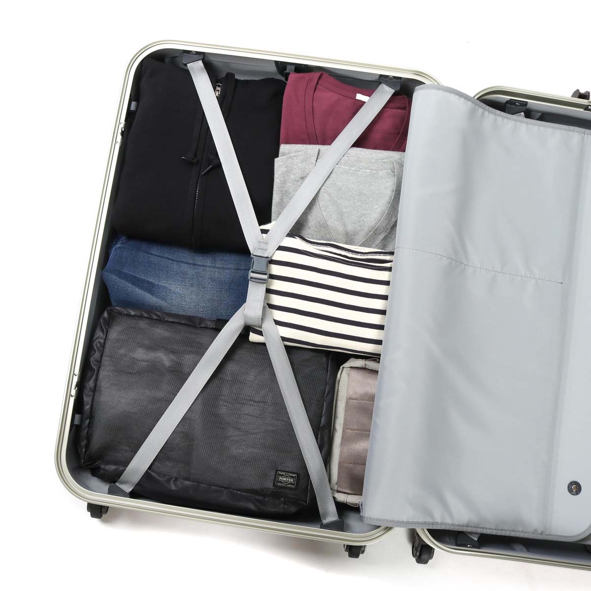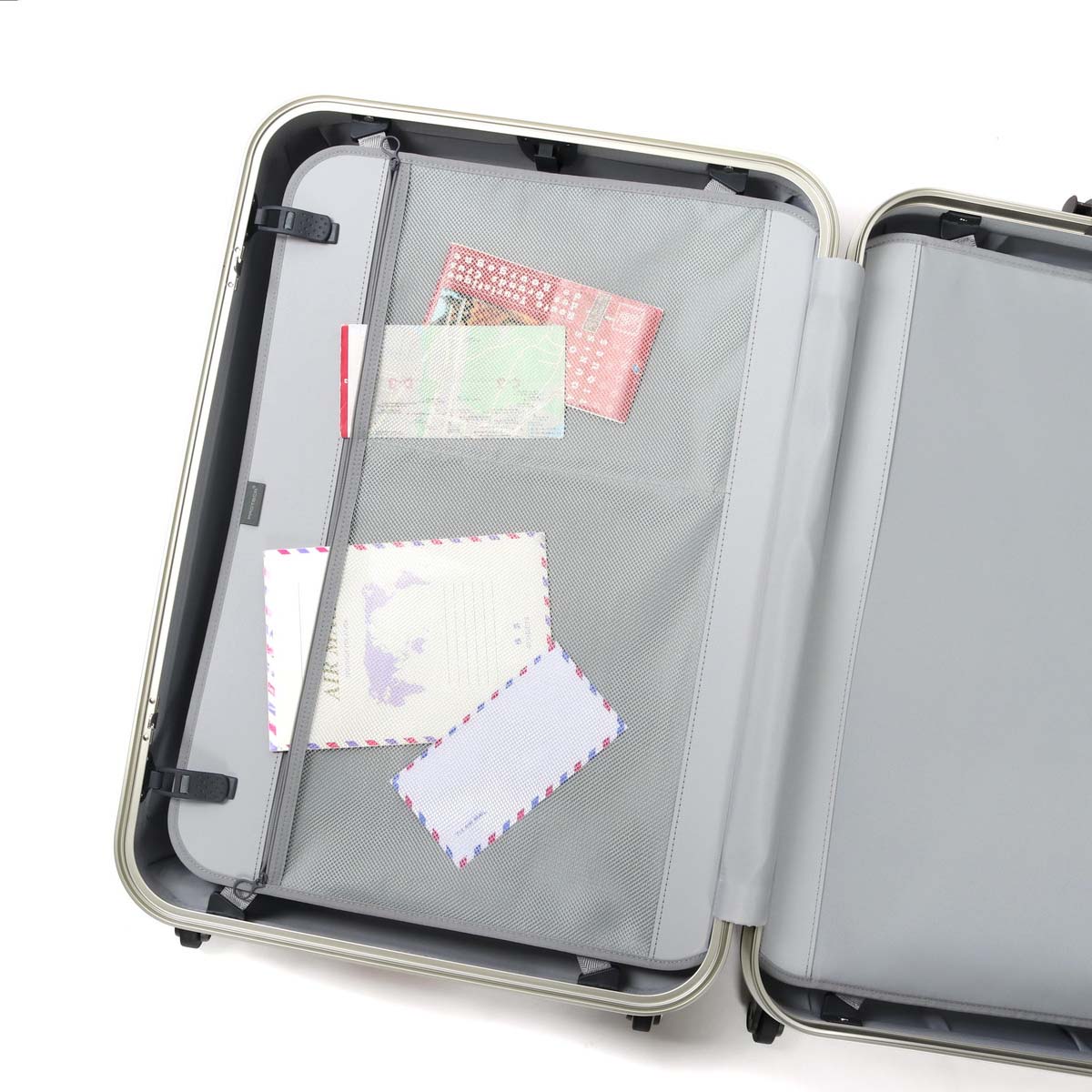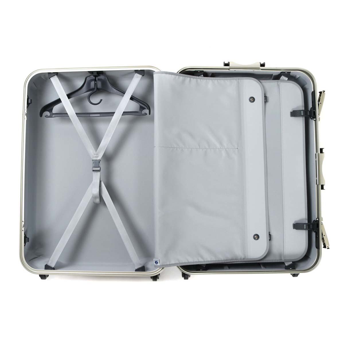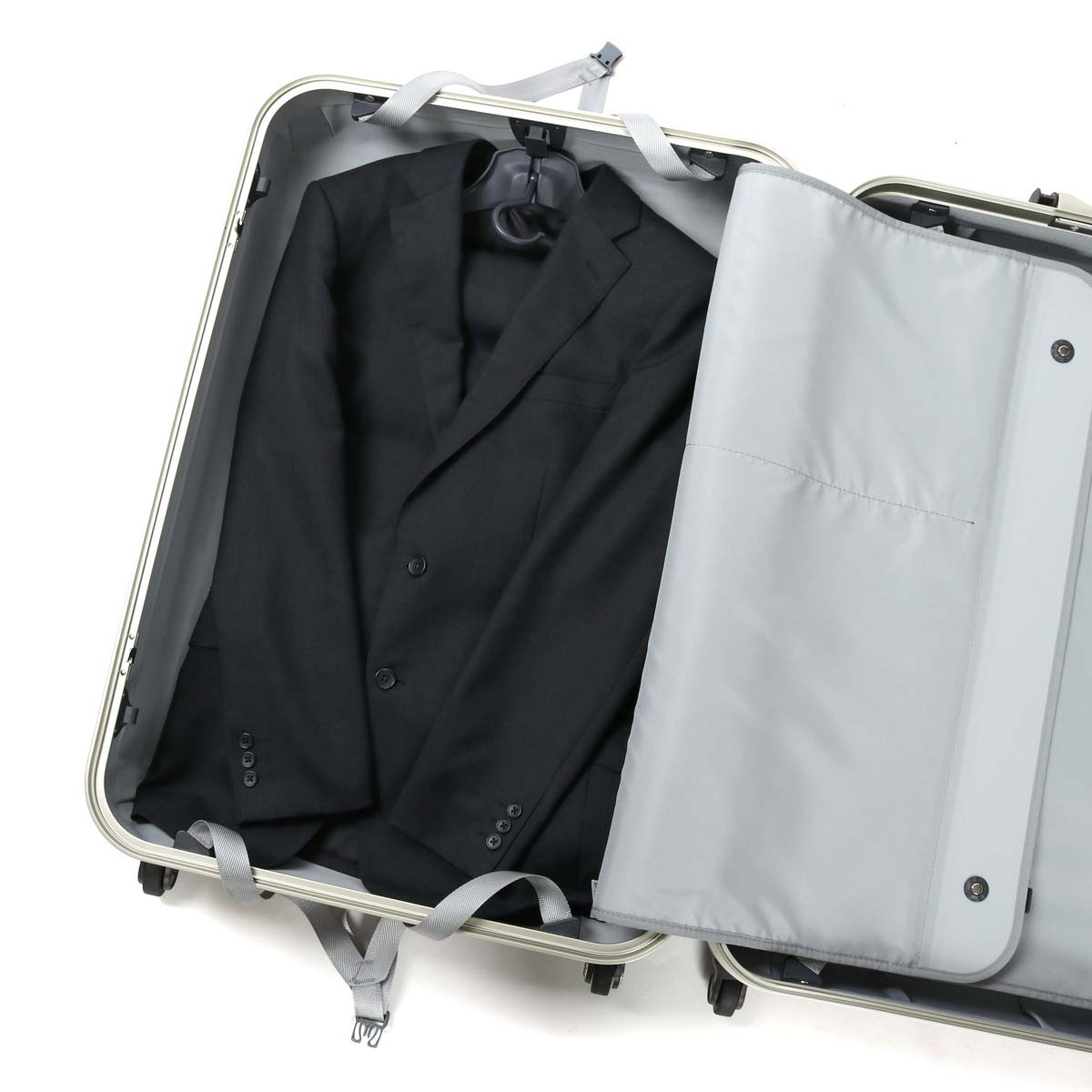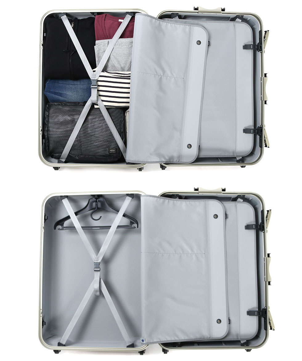 Interior decorating gently for luggage, both sides are equipped with a crossbelt and a middle divider and it also prevents collapse firmly. Mesh zip pockets are provided for the partitions, and paper items such as brochures can be managed without bending. In addition, hangers that can store suits and coats cleanly are attached, making high functionality is also a point.