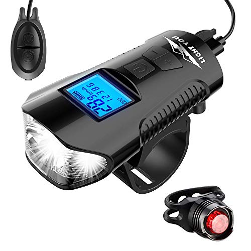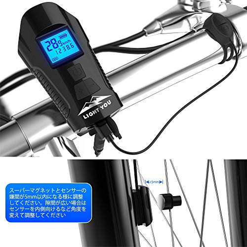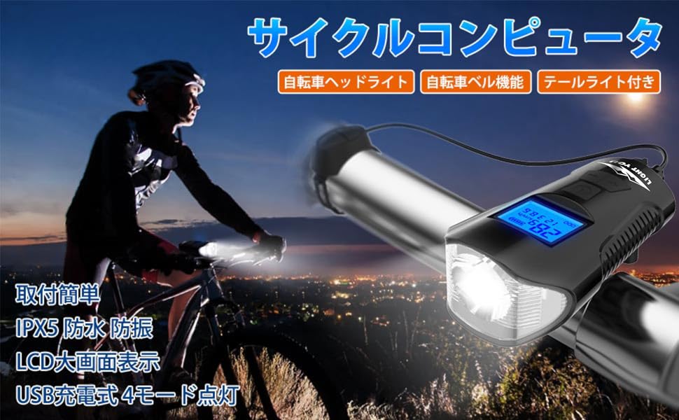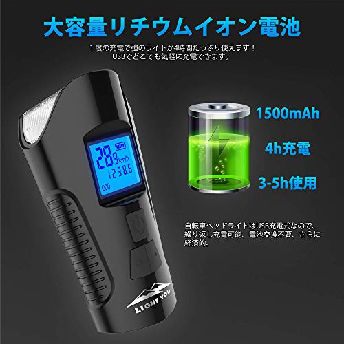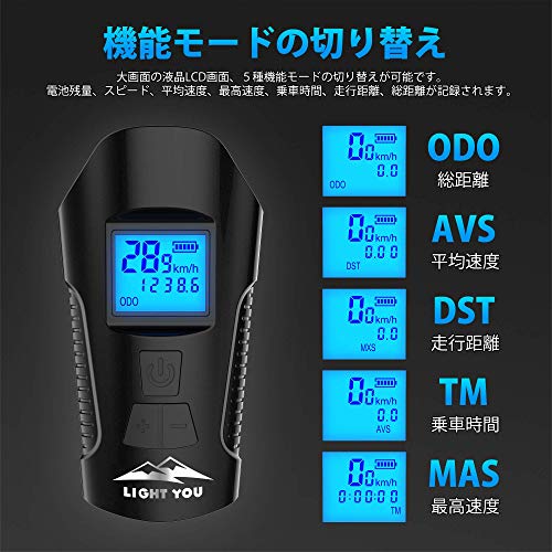 LightYou サイクルコンピュータ 自転車ヘッドライト テールライト付き 自転車ベル機能 USB充電式 4モード点灯 IPX5 防水 防振1500mAh 懐中電灯兼用LCD大画面表示 取付簡単