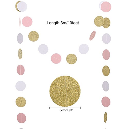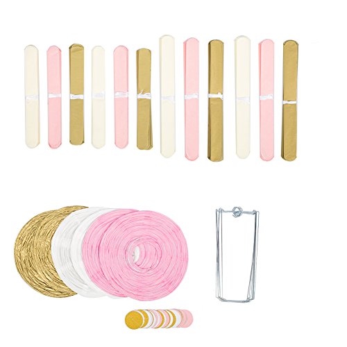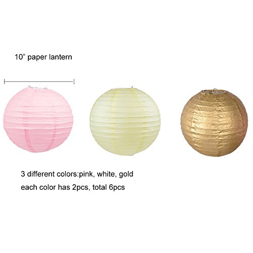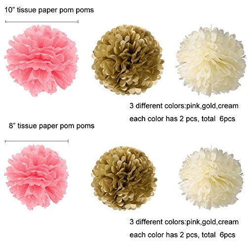 WHAT YOU GOT: 12 tissue paper pom poms(8 inch-2* Pink+2* Cream +2* Gold,10 inch-2* Pink+2* Cream +2* Gold);6 paper lanter(10 inch-2* Pink+2* Cream +2* Gold);1 * 10 feet circle dots paper garland.This party set are perfect for decoration your special occasion.
