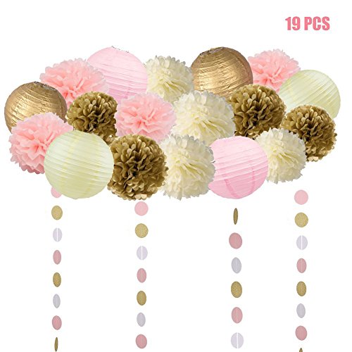 19 Pcs Pink and Gold Tissue Paper Flowers Pom Poms Lanterns and Garland for Baby Shower Party Decoration