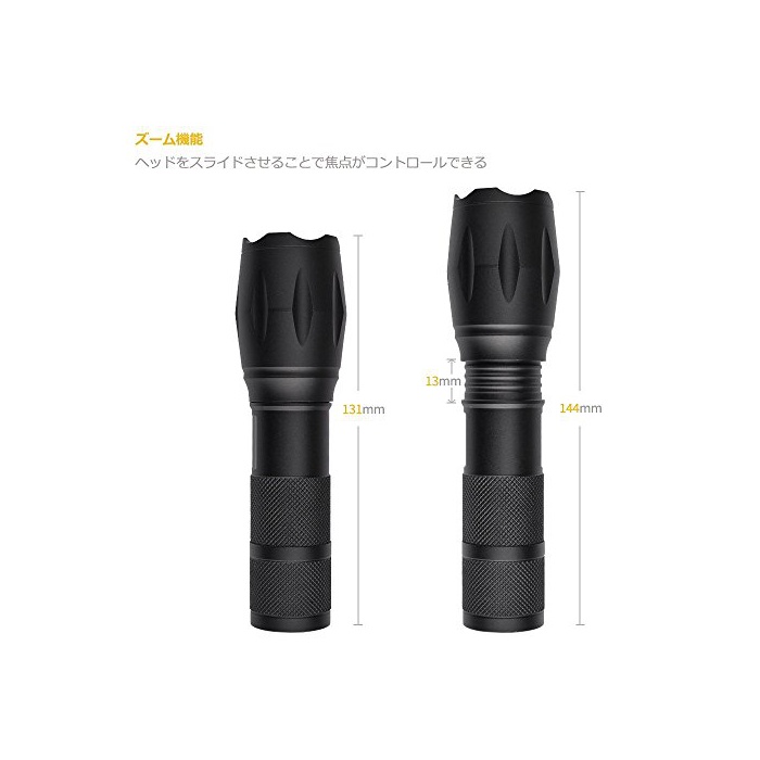 「줌 기능」: 본체 헤드부를 슬라이드 시키는 것에,근거리를 광범위하고 비추는 목적으로 한 와이드 빔과,원거리를 보다 멀까지 비추는 스포트 빔을 사용해 나누는 일이 가능합니다.