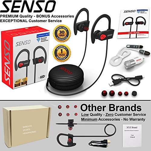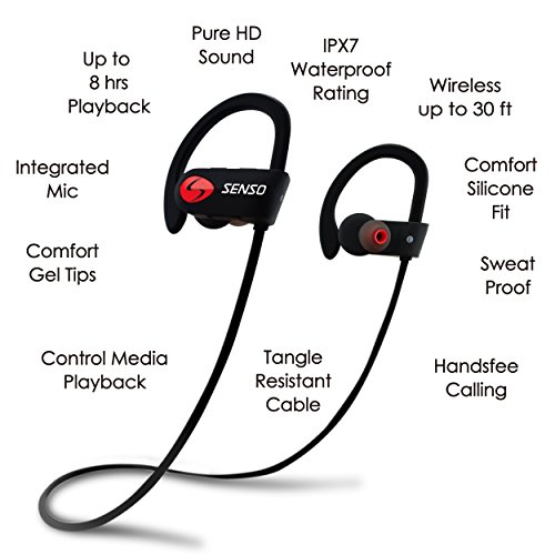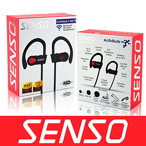 -. Binding : Wireless Phone Accessory -. Brand : Senso -. Color : Black -. EAN : 0659257974666 -. Feature : TRUE HD HIGH FIDELITY SOUND - Featuring latest Bluetooth 4.1 CSR technology and state of the art acoustic components that produce incredible sound quality with deep bass and crystal clear treble. / COMFORTABLE AND SECURE FIT WITH IPX-7 WATERPROOF RATING - ActivBuds feature Ergonomically designed flexible ear hooks with gel flex silicone earbuds to ensure your headphones stay comfortably firm in place to guarantee fatigue free ears and tangle free comfort. / LONGEST BATTERY LIFE - The new and improved lithium polymer battery allows seamless enjoyment of music for up to 9 hours and 240 hours stand-by with a quick charge of only 1.5 hours. / BLUETOOTH V4.1 WIRELESS TECHNOLOGY WITH CVC 6.0 NOISE SUPPRESSION TECHNOLOGY - Connect seamlessly with all Bluetooth enabled devices up to 30 feet away. With Noise Suppression technology focus on your favorite music and answer calls without skips or missed words. / 1 YEAR WARRANTY AND BONUS ITEMS - Bonus Accessories with 1-Year Manufacturer's Warranty and 30 days no-questions-asked return policy. Value for money guaranteed, Buy the Senso ActiveBuds worry free today. -. Label : Invotek -. Manufacturer : Invotek -. Model : ActivBuds S-250 -. PackageQuantity : 1 -. ProductGroup : Wireless -. ProductTypeName : WIRELESS_ACCESSORY -. Publisher : Invotek -. Studio : Invotek -. Title : SENSO ActivBuds Bluetooth Headphones, Wireless Sports Earphones w/ Mic IPX7 Waterproof HD Stereo Sweatproof Earbuds for Gym Running Workout 9 Hour Battery Noise Cancelling Sports Headsets -. UPC : 659257974666
