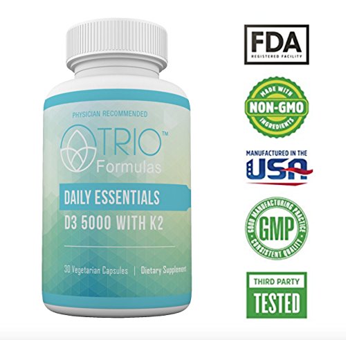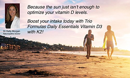 Trio Formulas Vitamin D3 & Vitamin K2 (as MK-7) Supplement kept simple. Two Essential Nutrients, One Convenient Capsule. Trio Formulas Vitamin D3 with K2 provides just the right amount of each essential vitamin to maximize their benefits to your bones and heart. VITAMIN D3 Vitamin D (specifically D3, the form of Vitamin D you get from the sun) is essential for properly absorbing the calcium we all know is so important as we age. Without D3, you may be missing out on benefits from the calcium in your diet. Most people start taking Vitamin D3 after they experience signs of deficiency. Signs of deficiency may include: "The Blues," Feeling down more than usual, Achy Bones, Brain Fog, difficulty thinking clearly, Gastro-intestinal troubles. Those most prone to Vitamin D deficiency are Older Adults, Restrictive Diets - (vegan, etc.), Darker Skin Tones and Overweight Individuals. VITAMIN K2 (as MK-7) You may have heard that D3 shouldn't be taken alone- and it's true! Let us explain. While Vitamin D ensures that calcium is absorbed, Vitamin K2 (specifically as MK-7, the most bioavailable form) directs it to areas of your body such as your bones, so it can be put to good use. Without K2, the calcium absorbed may be deposited in the arteries, where it can lead to calcification or other issues. The Bottom line is, Vitamins D3 with K2 are truly the perfect pair. If you're serious about supporting healthy bones and Heart Health, Experience the benefits of Trio Formulas D3 5000 IU with K2 and Click the Add to Cart Button Now!Feature