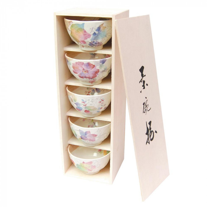 ぶどう、ぼたん、萩、桔梗、からすうりの5柄の飯碗揃です。大切な方へのギフトにも最適です。