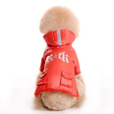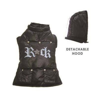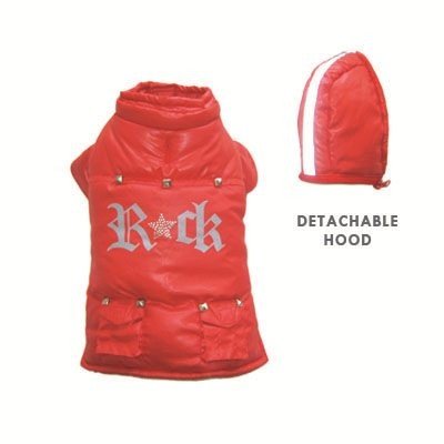 -. Binding : Misc. -. Brand : DOGO 100 -. Feature : Velcro Closure / 100% Polyester / Open slit on the back for D ring leash to slip through / Zipper removable reflector hood / Machine Washable -. Label : Dogo -. Manufacturer : Dogo -. PackageQuantity : 1 -. ProductGroup : Pet Products -. ProductTypeName : PET_SUPPLIES -. Publisher : Dogo -. Studio : Dogo -. Title : Dogo Designer Rock Star Dog Jacket With Removable Hood Red or Black