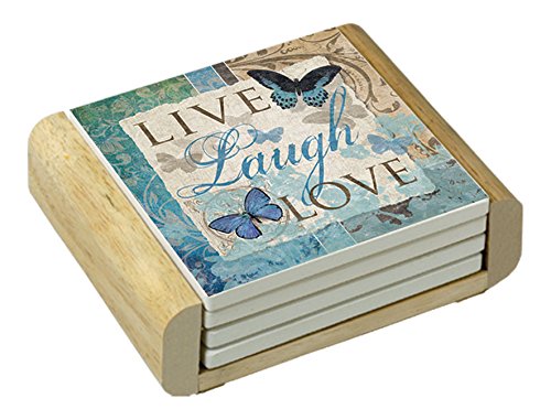 - Coasters are natural stoneware with decorative transfer print