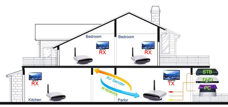 Applications It transmit AV signals by means of radio waves and can be used for wireless sharing of AV signals of DVD,DVR,CCD camera,IPTV,satellite STB,digital TV STB and other AV devices of several TV sets