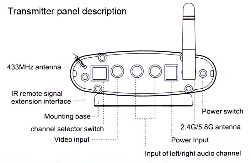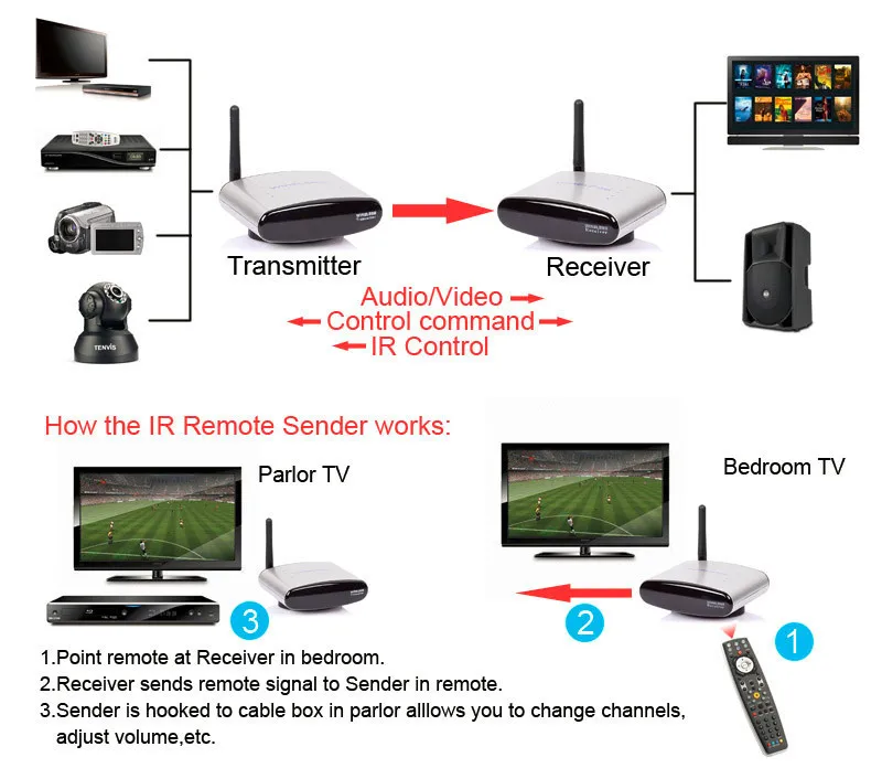 It can transmit AV signals of DVD, DVR, CCD camera, IPTV, satellite STB, digital TV STB and other similar devices, by means of radio waves and receive them at distant end and input them to a TV set to be displayed. Moreover, the IR remote controller can be used at the receiving end to realize the function of wireless control of devices from another place.