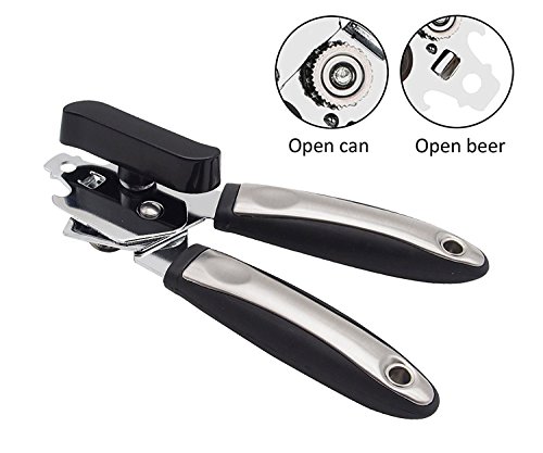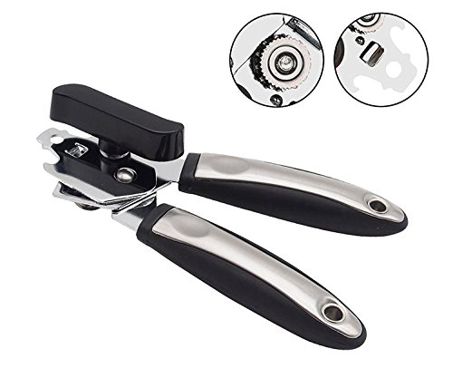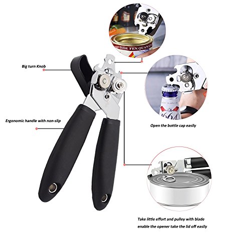 HIGH QUALITY - This Multifunction can opener is designed for long-term use, made of food-grade stainless steel and heavy-duty plastic.